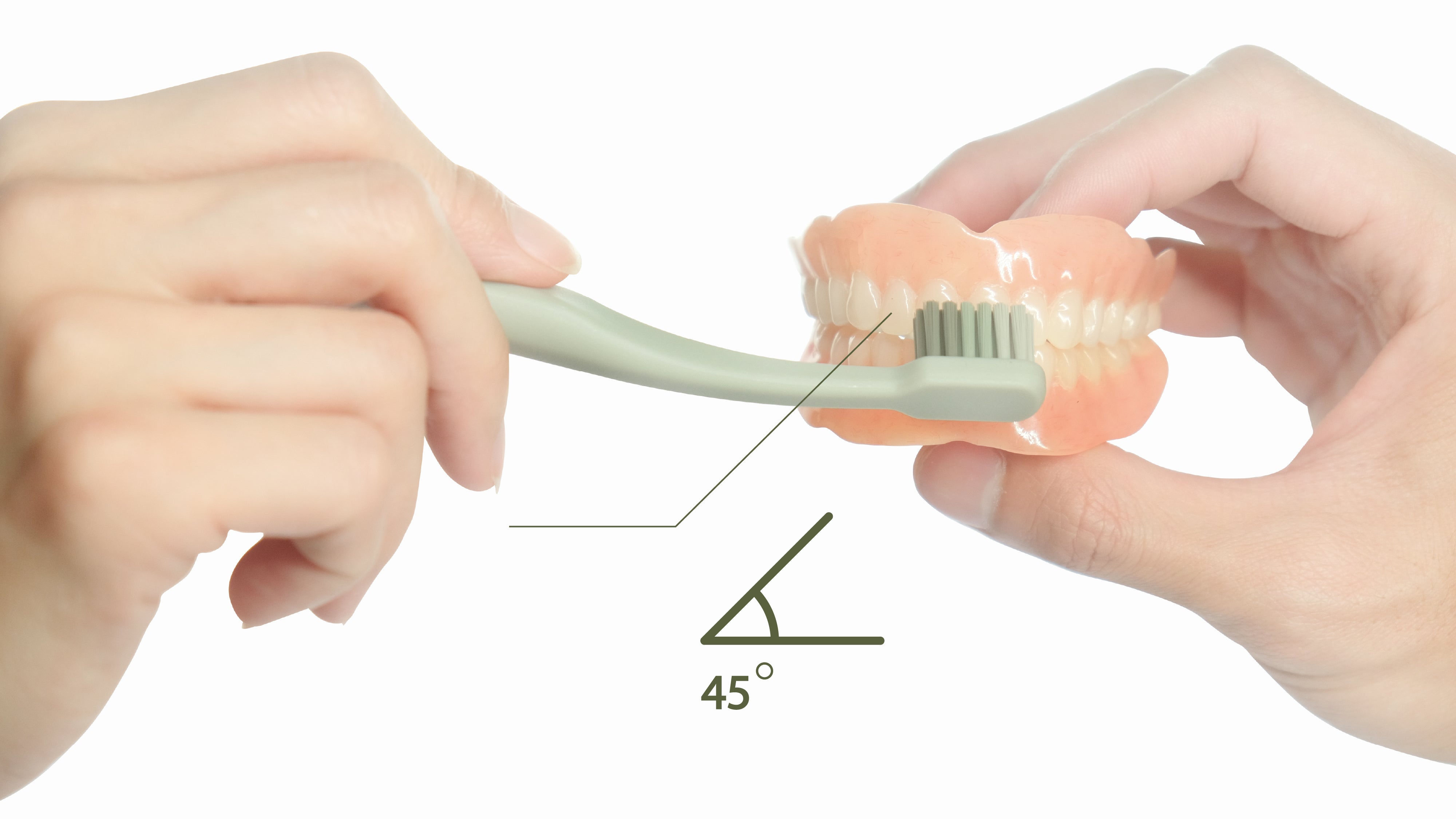 - 刷毛與牙齒呈45 度角: 並對準牙齒與牙齦的交界處。